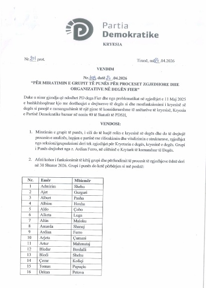 Grupi i punës i përbërë prej 43 anëtarësh do të shërbejë si Kryesi e PD në Fier dhe kryetari i komanduar do të jetë doktor Ardi Ferro.